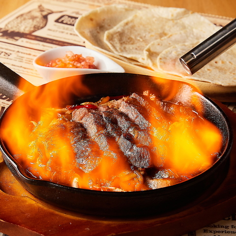 熱々鉄板料理!ご希望の方に目の前でテキーラをフランベして仕上げます。グリルした肉とガーリックでソテーした彩り野菜をトルティーヤで巻いてお召し上がりください。/◆CHICKEN:1,650円(税込) ◆BEEF:2,090円(税込)【トルティーヤ1枚追加+税込165円】