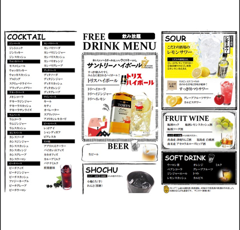| ソフトドリンク | ウーロン茶、ペプシコーラ、ジンジャエール、レモンスカッシュ、オレンジ、グレープフルーツ、トマト、カルピス、ミルク |