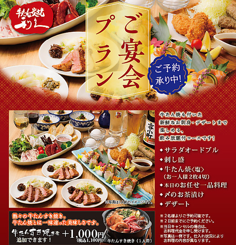 ご宴会にピッタリな飲み放題付きのコースをご用意!牛たんと旬の味覚の逸品料理を心ゆくまでお楽しみ下さい