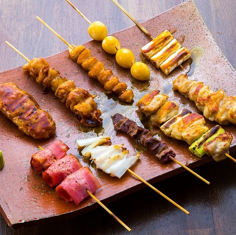 特大サイズの串焼きセットは、食べ応え抜群の一品です!自家製・店内仕込みの串焼きは、1本1本気持ちを込めて丁寧に仕上げています♪定番のねぎま、とりもも、牛ハラミの3種類は、ボリューミーでジューシーな味わいが楽しめます◎パクパク食べられるこのジューシーな串焼きを是非ご賞味ください!