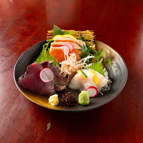 贅沢な食材を使用したお料理が味わえる【炉端ばんざい】。お写真はおまかせ 刺身盛合せ五種盛。質にこだわり、見た目でも楽しめるお料理が当店の魅力です。気になるメニューはぜひ一度ご賞味あれ。