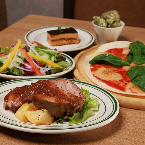 〇自家製あおさのゼッポリーニ〇ランチサラダ〇ピザ(マルゲリータ/オリーブと彩り野菜のシチリア風/アンチョビときのこ/クワトロフォルマッジ)〇メイン(若鶏のオーブン焼き/豚肩ロースト)〇デザート(ピスタチオジェラート/黒糖ティラミス)〇ドリンク(コーヒー/紅茶/ ウーロン茶/オレンジジュース/コーラ)※追加料金有