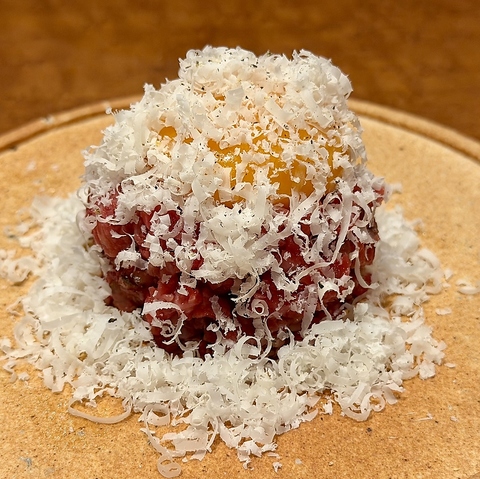 【円蔵名物ユッケ】鮮度抜群のお肉をお届けしております。口の中でとろける食感が堪らない逸品です。お食事の前菜としても、お酒のおつまみとしてもお楽しみいただけます♪お仕事帰りのお一人様でのご利用や、デートにもおススメです。お食事の際は、まず自慢のユッケをご賞味ください。