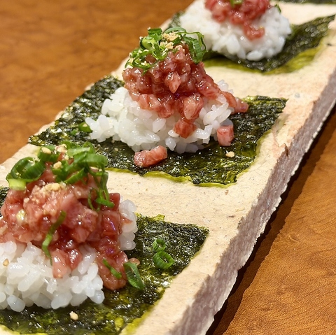 自慢のタレを漬け込んだユッケは塩タンに続く円蔵で大人気の商品!とろろユッケやネギ塩ユッケ、さまざまなユッケをお楽しみいただけます。他ハート刺し、センマイ刺しと品揃え豊富です!
