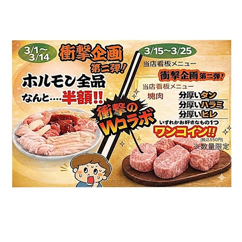期間限定3月より始動!!ホルモン 税込319円から塊肉 税込550円