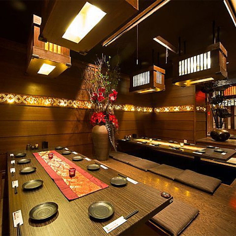 間接照明の効いた大人な雰囲気の広々としたゆったり個室は接待や会社同僚の宴会にぴったりです。歓送迎会