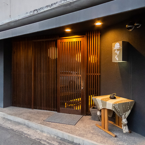JR倉敷駅から徒歩5分の立地に佇む、和を基調とした粋な外観です。店内は木の温もりに包まれた落ち着いた雰囲気で、料理や美酒をじっくりと愉しんでいただくための空間づくりにこだわりました。カウンター席では店主の仕事ぶりを眺めながら、非日常の素敵な時間をお過ごしいただけます。