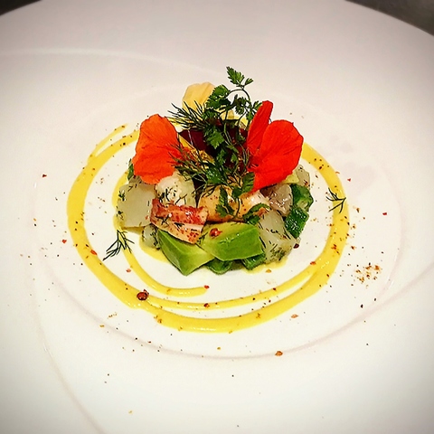前菜は旬に合わせて新鮮な食材を一皿一皿に真心を込めてご提供します(前菜の一例:写真は平目、サーモン、蟹のタルタル、ハーブサラダ添えです)
