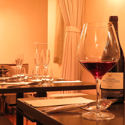 仏産の品質の高いワインを約20種取り揃えております。赤、白共に3種類ずつグラスでのご用意もございますので、お好みや料理、ご気分に合わせて選んでみてはいかがでしょうか
