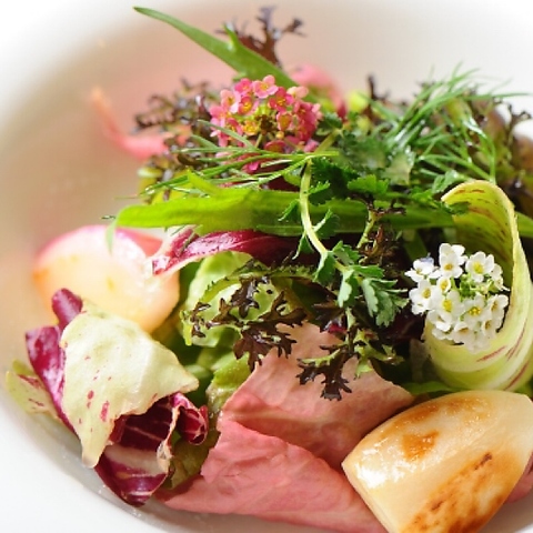 彩りある農園直送野菜のサラダと魚料理、肉料理(鶏、豚肉等)を両方ともお楽しみいただける全4皿のランチコースです。メニューは季節毎に食材や調理法を変えてご用意いたします。