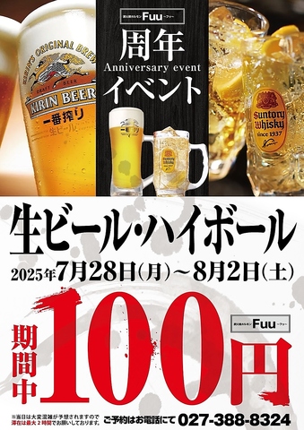 周年イベント開催!2025/7/28(月)~8/2日(土)の期間限定で、生ビール・ハイボールをなんと100円(税込)でご提供いたします!この機会にぜひご来店ください♪※当日は大変混雑が予想されますので、滞在は最大2時間でお願いしております。