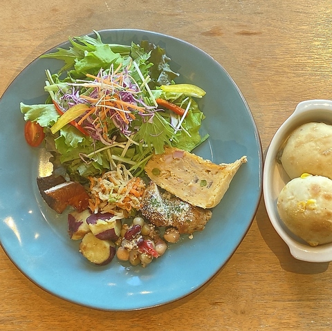 女性に大人気、たっぷりの野菜の総菜プレートです!!ボリューム満点ですがとてもヘルシーな1皿です、本日のパン2種類or十六穀米とお楽しみください!!スープ・ドリンク付