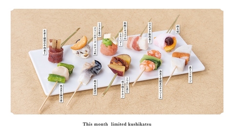 【今月の限定串】旬の串十本セット 内容:限定串十本、1ドリンク 又は選べるご飯(お茶漬け・じゃこ飯と味噌汁・法隆寺醤油の卵かけご飯) ※セットには限定デザートは含まれておりません。