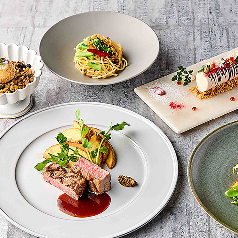 渋谷ストリームは渋谷駅直結で雨にぬれずに来店できます☆記念日、誕生日、女子会のシーンを前菜。パスタ、牛サーロインのメインディッシュまで楽しめる全5品のコースです。