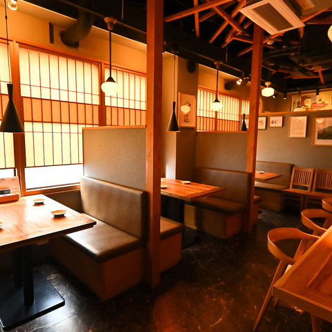手元を照らす落ち着いた光でゆったりとした時間をお過ごしいただけます。ボックス席もあり、4名様でも広々とくつろいでいただけます。