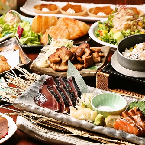 豪華宴会コースでおすすめ!「 名物!カツオの藁焼きと鮮魚藁焼き 食べ比べ」をはじめ、た藁やならでは「藁焼き」をお楽しみ頂けます♪定番からオススメの逸品まで全9品。生ビールもOKの2時間飲み放題付き!◆+1100円でドリンク全品OKのプレミアム飲み放題に♪(L.O.30分前)