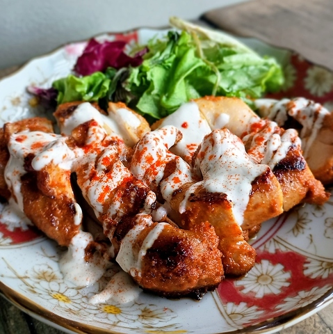 自家製マリネのタンドリーチキンヨーグルトソースで爽やかなアクセントターメリックライスを合わせて、NY屋台飯のチキンオーバーライスもあります。