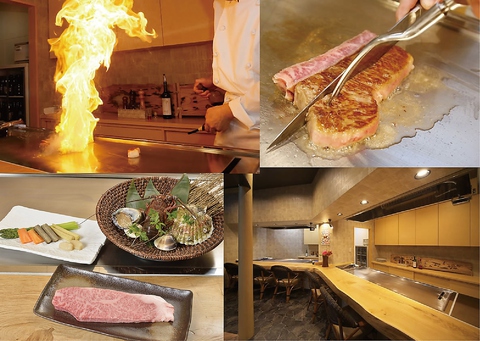 熟練の職人がみなさまの目の前で調理致します。味はもちろん、目でも愉しませてくれるパフォーマンスに圧巻!!※現在鉄板焼きメニューのご提供を休止しております。