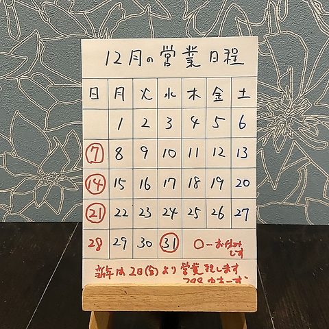 基本日曜日定休・日曜含む連休の場合、最終日がお休みです。 たまにイレギュラーありです・カレンダーご参照ください! |