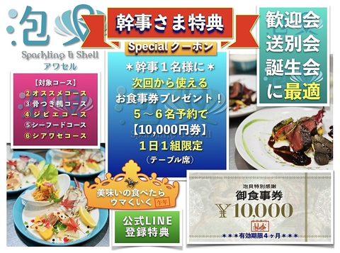 5から6名のご予約で、次回から使える1万円分のお食事券を幹事さま1名にプレゼントいたします。公式LINEよりクーポンをご利用できます。他にも、誕生日特典や現金会計特典もございます!