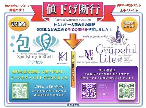 仕入れや一人前の量を調整、効率化などの工夫で全ての価格を見直しました。歓送迎会シーズンに朗報!