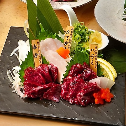 各種「馬刺し」は熊本県産の馬肉を使用。是非ほんとに旨い馬を召し上がって頂きたい。