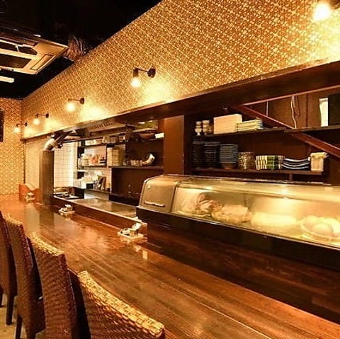 【カウンター席 : 16名様まで】お一人様大歓迎◎調理を目の前で楽しめる特等席♪1階のカウンター席は、料理人が腕をふるう様子を目の前で楽しめる特等席。ジュウッという音や香ばしい香りに包まれながら、五感で料理を味わえます。大将との会話も楽しみのひとつ。