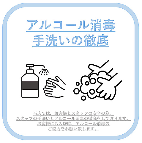 手洗い・アルコール消毒をこまめに行っております。また、店内の備品やお席のアルコール消毒も徹底している為、安心して当店をご利用下さい。入店時、お客様にも手指消毒のご協力をお願いしております。