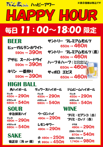 毎日11:00~18:00限定でハッピーアワーを開催中!生ビール390円~、角ハイ290円~、ウーロンハイ290円