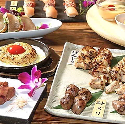 豪華前菜プレートをはじめ、新鮮鶏刺し、ジューシー鶏の焼き鳥、つくねバーグまで揃った、当店自慢の本格炭火焼き鳥を満喫できるコース生ビール・ワイン含む2H飲放題付で宴会にも最適◎※+550円でプレミアム飲み放題おつけできますテーブル18名様、完全個室2部屋12名様、5名様まで可能です☆