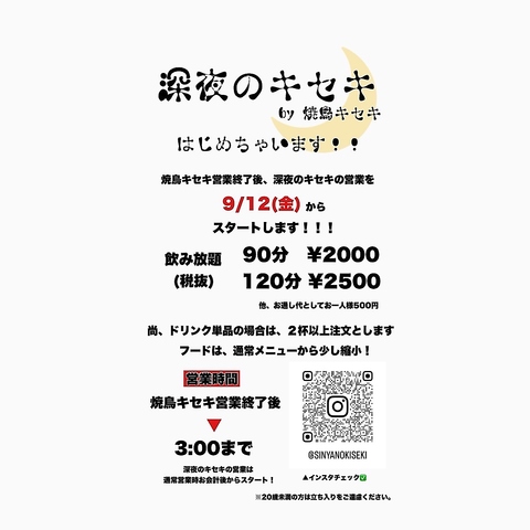 深夜のキセキ始めました。金曜日・土曜日・日曜日・祝日・祝前日は27:00まで営業中★