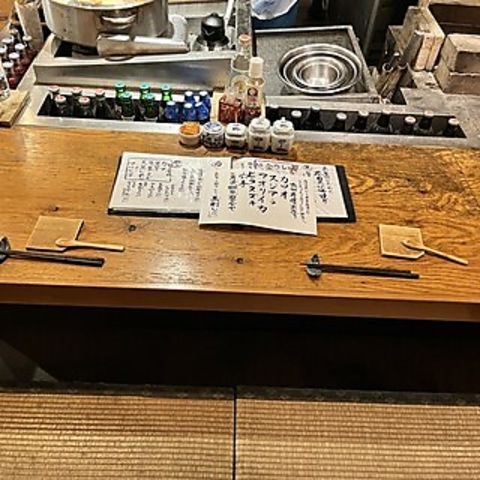 【目でも楽しめるカウンター席】カウンター席は炉端焼きや調理風景が目の前で見えるので、注文をお待ちしている間も楽しめます。ご夫婦・カップルでのご利用はもちろんのこと、お一人様でのサク飲みにもおすすめです。ゆったりとした広めのお席なので、お隣との距離も気にすることなくお過ごしいただけます。