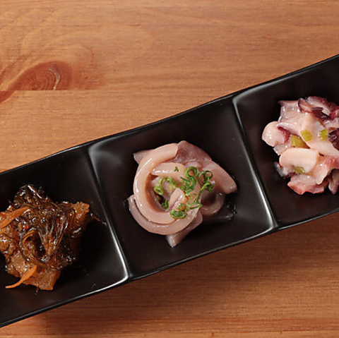 数の子たっぷり松前漬け・烏賊の塩辛・ごろごろ蛸ワサビが入った贅沢おつまみ。北海道ご当地の珍味がおつまみで3種類も楽しめる!深い味わいは、お酒との相性も抜群です。