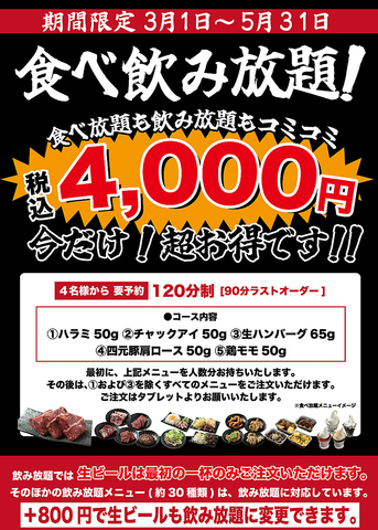 <超お得です!!>期間限定で食べ飲み放題120分(90分ラストオーダー)のコースをご利用いただけます!満足するまで食べられるワクワク感満載の内容です★ビールは最初の1杯のみになりますが+1000円でなんと3時間飲み放題にできます!30種類の飲み放題メニューがあり充実。歓送迎会や各種宴会にも是非どうぞ!