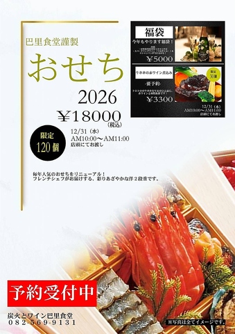 フレンチシェフが手掛ける彩りあざやかな洋2段重のおせちを限定120個ご用意いたします。豪華内容の福袋も♪