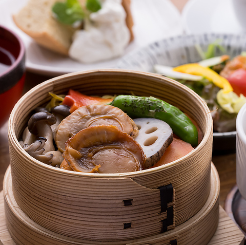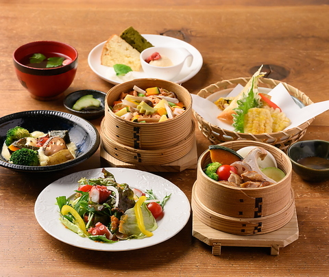ご予約不要で当日注文可能なディナーわっぱセットメニューです。お好みの京わっぱに、前菜や季節のサラダ、お吸い物、香の物まで付いた大満足のセットです。旬のものを存分に味わいたい方にもオススメです。わっぱの種類は小・大・種類も選べます