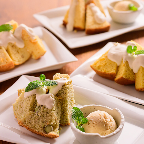 厳然した材料を使ったきのわの京米シフォンケーキ。一台一台丁寧に焼き上げています。ふわふわの食感や素材の味をお楽しみください。スフレグラッセアイスクリーム付き。スイーツ時間に提供。