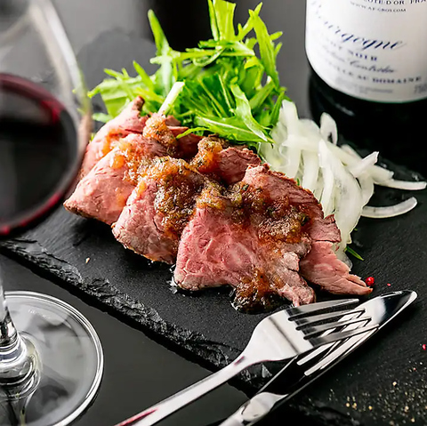当店で大きなお肉から厳選した部位を使い、じっくりと低温調理で仕上げた自慢のローストビーフ。お肉の旨味をしっかりと中に閉じ込めお肉本来の旨味が感じれれる逸品。ローストビーフに合うように作られたおろしソースでお召し上がりください♪