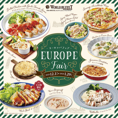 期間限定『ヨーロッパフェア』開催中!カリーヴルストやコルブストロガノフなど、なかなか味わえない本格料理が多数登場!他にも和食、洋食、スイーツございます♪出来立ての絶品料理をぜひご堪能ください。詳細は料理ページにて!【期間限定:2025年12月1日~2026年1月29日】