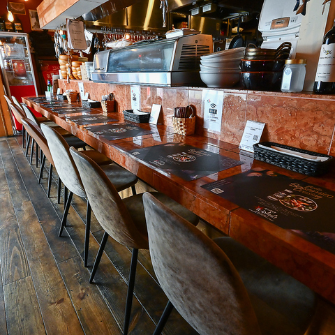 【お一人様大歓迎◎】入口からも見える大きなカウンターは当店の目印!広めに間隔で窮屈さを感じないカウンターはお一人様はもちろん、並んで座りたいカップルの方にも好評です♪