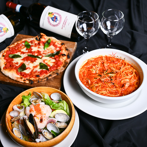 【飲み放題80種×定番イタリアン】コースは飲み放題付で各種ご用意!当店の数多いメニューから厳選した人気料理を揃えました◎ピザにパスタにメインのお肉でボリューム満点!