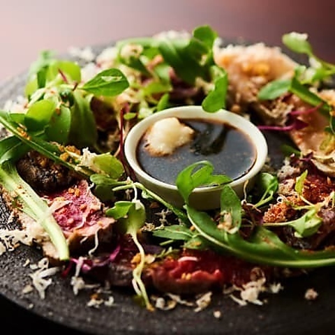銚子港より新鮮な状態で取り寄せるお魚のあか身を高温の藁で一気に焼き上げることで、外は香ばしく中はしっとりとした絶妙な食感に仕上げました。藁焼きならではの芳醇な香りがあか身の旨味をさらに引き立てます。ビーツの自然な甘みと濃厚なチーズの塩味がお魚のあか身の旨味を際立たせ、口の中で絶妙なハーモニーを奏でます。味だけではなく見た目も鮮やかで食欲をそそる一皿。ワインと合わせて、より一層魚料理をご堪能下さい。