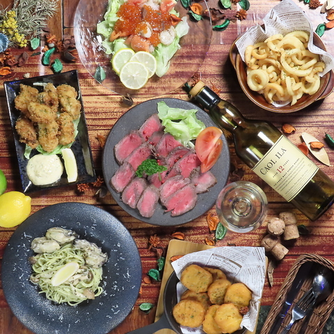 ホットペッパー限定2時間飲み放題コース(2,000円)や、5品の料理付きコース(5,200円)、パスタ1品+飲み放題コース(3,000円)、用途で使い分けられるコースを各種ご用意しております!貸切ご利用は8名様~承りますので、新天地公園近隣でご宴会の際は是非♪またクーポンにて税込価格もございますのでご活用ください!