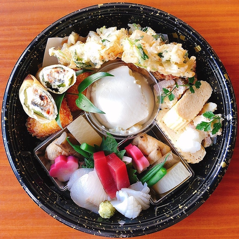 【オードブル内容】・手作り豆富・お造り2種盛り合わせ・炊き合わせ・揚げ物(うなぎチーズ春巻き、手羽唐揚げ、かき揚げ、コロッケ)・焼き物(出し巻き玉子、ポテトサラダ)※仕入れにより内容が変更となる場合がございます。