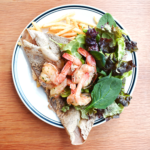 野菜ドーン!海老バーン!体に優しいサラダとスパイシーなシュリンプのガレットです。