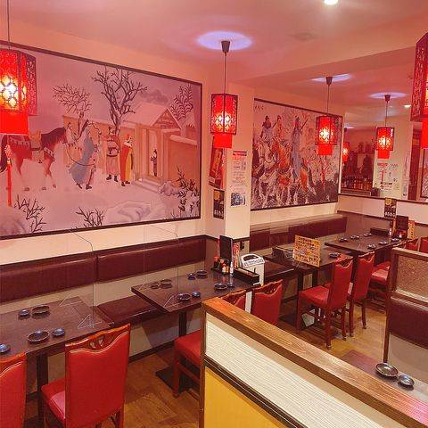 壁に描かれている三国志の迫力ある絵を見ながら本格中華をお召し上がりください。またランタンやインテリアも古き中国を思わせる内装で料理だけでなく雰囲気も楽しんでください。