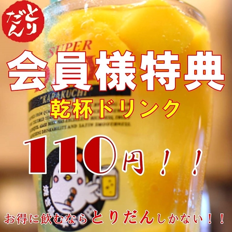 とりだん会員様は乾杯ドリンク1杯110円(税込)◎ 初めてご利用の方も次回から特典がご利用いただけます♪