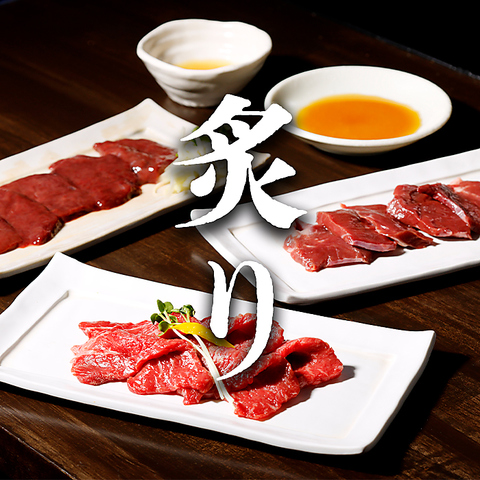 【食し方】・肉を鉄板に載せたらサッと炙る!新鮮だからこその限定料理をそれぞれの美味しい食べ方でご賞味ください。ももは特製の黄身ダレ、レバーはごま油・ハツはわさび醤油でお楽しみください。