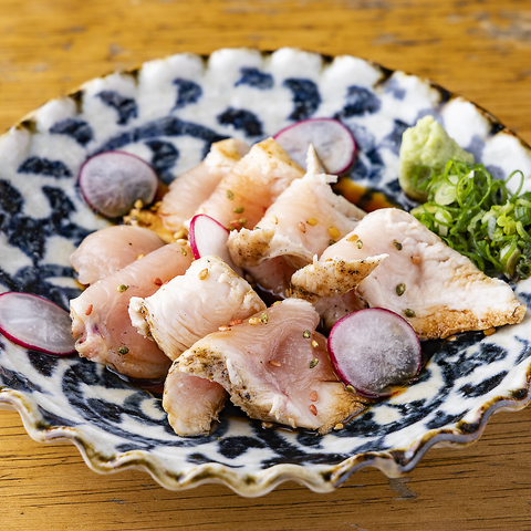 もともと闘鶏用の品種だった軍鶏は、通常の鶏に比べて引き締まった肉質が特徴です。脂肪が少なく、あっさりとしていますが、噛めば噛むほど口の中に旨みが広がります。“軍鶏刺し盛り合わせ”1628円(税込)は、それぞれ食感や味わいが違う数種類の部位が一皿で楽しめます。新鮮な軍鶏だからこその贅沢な旨みを堪能できる、必食の一品です。