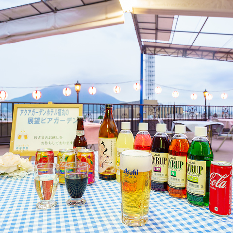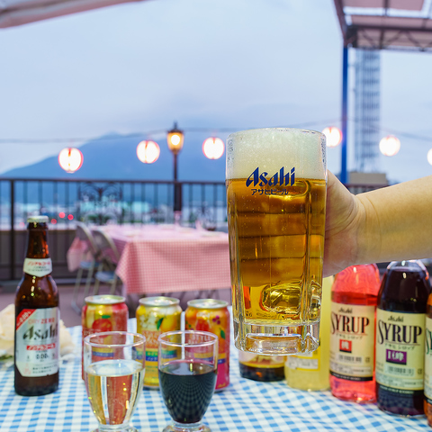 生ビールもOKな2H飲み放題、お刺身やお肉料理、麺物、ご飯物まで全12品が付いたビアガーデンコースは毎年リピーターも続出!雄大な桜島を望むベイエリアの屋上テラス席という最高な空間で
